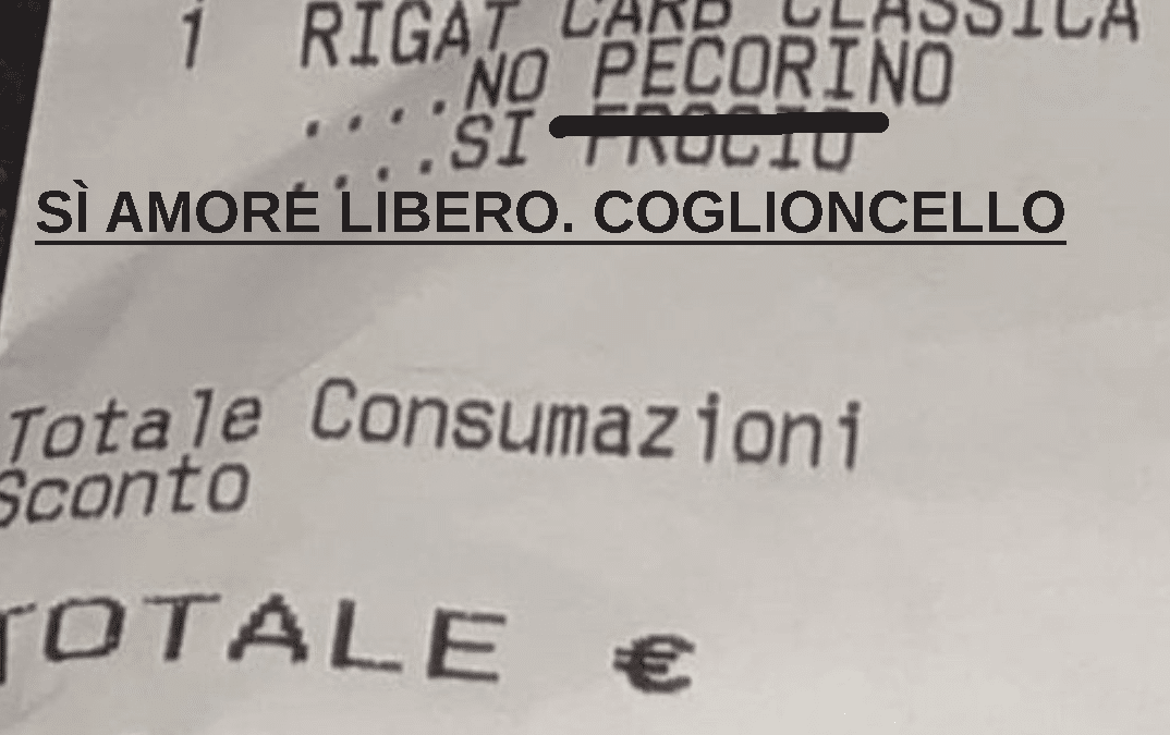 Per chi non lo sapesse il fatto è questo: una coppia di ragazzi gay, dopo aver cenato nella Locanda Rigatoni della capitale, si è vista arrivare uno scontrino che, oltre al conto, riportava insulti omofobi “pecorino no. froci sì”.